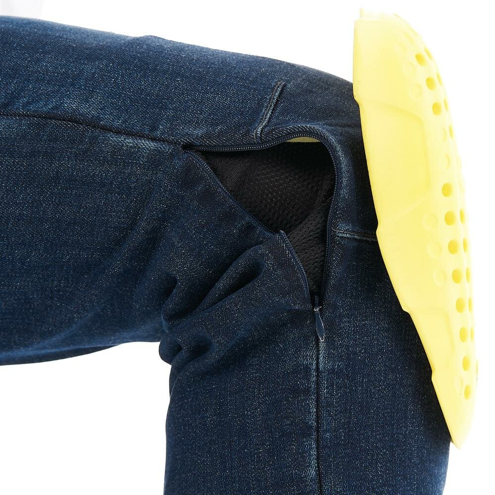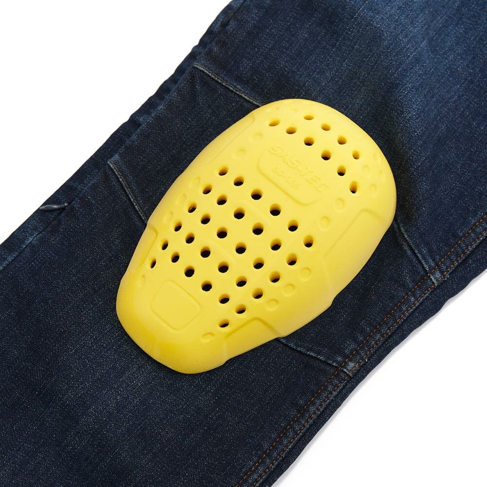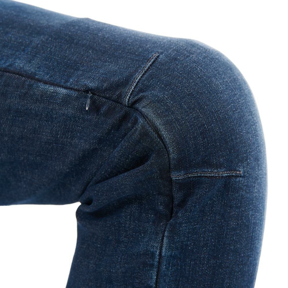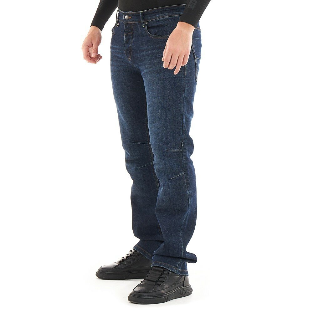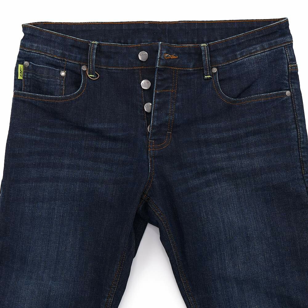 Ширинка джинсов надежно застегивается на 4 металлические пуговицы. Имеются шлевки для ремня, на одной из которых размещено полукольцо D-ring для подвешивания перчаток или ключей. 5 карманов закрывают все потребности райдера. Сзади на поясе есть молния длиной 20 см, которая позволяет пристегнуть штаны к куртке.