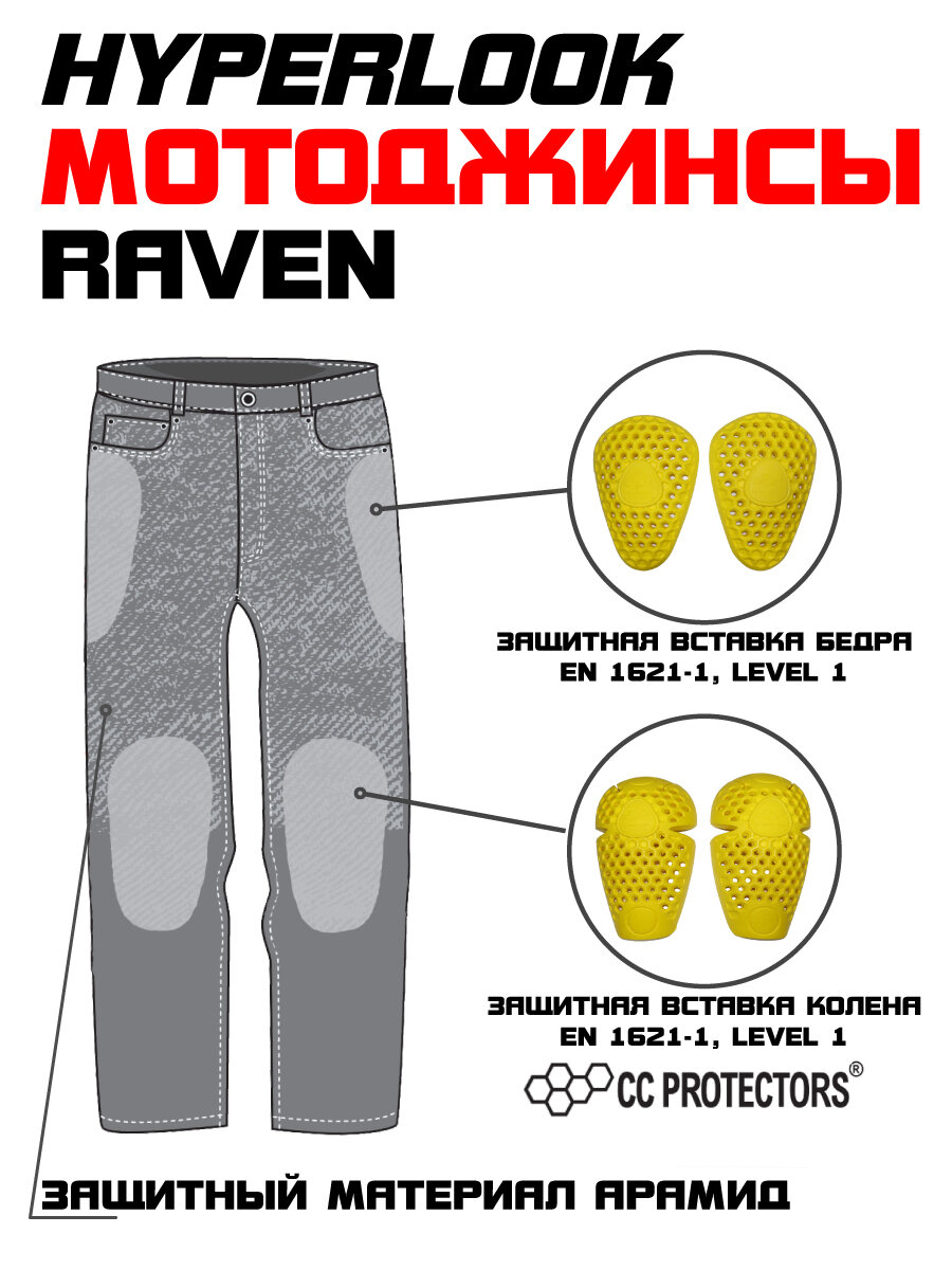 Мотоциклетные джинсы Hyperlook Raven сшиты из плотной и приятной джинсы турецкой фирмы Sevgili. Внутренние усиление из арамидной ткани выполнено классическом стиле Hyperlook, арамидные шорты, усиление бокового шва арамидной лентой, а так же усиление арамидом в районе колен. Сертифицированные защитные вставки колена идут в комплекте, компания Hyperlook не экономит на защитных свойствах своих изделий и защитные вставки бедра СE идут уже в комплекте. Джинсы Raven обладают идеальной посадкой на теле, благодаря выточкам и конструкторским инновациям, которые были использованы при разработке джинсов. Гармоничный дизайн, высокий пояс защищающий спину от продувания , глубокие боковые карманы, высококачественная фурнитура соответствуют самым высоким запросам потребителя.