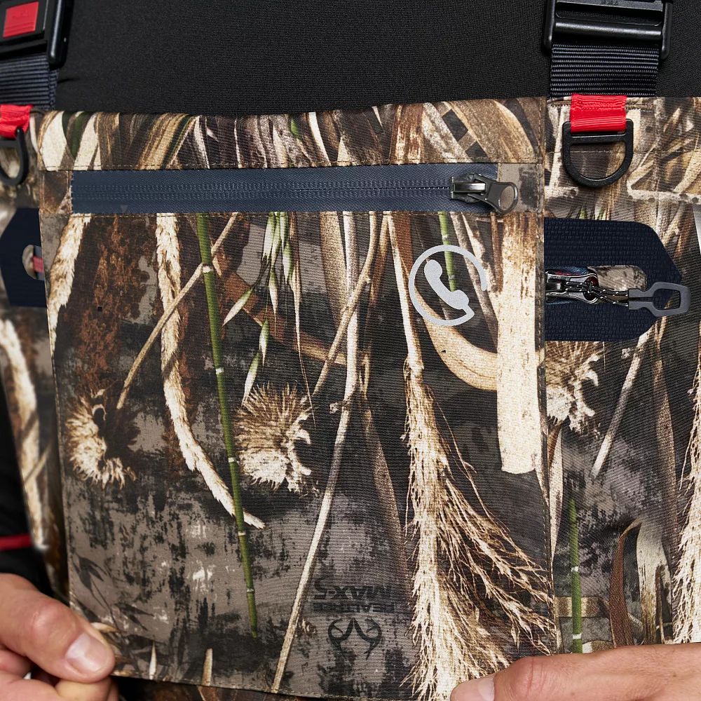 - Внешний влагозащитный нагрудный карман с молнией YKK Aquaguard для рыболовных аксессуаров.